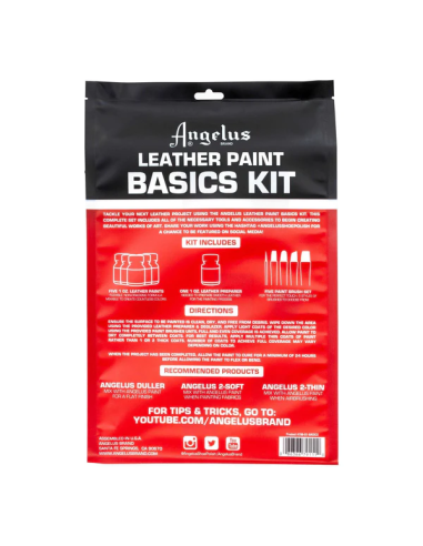 Kit básico de pintura para cuero de Angelus. Este juego completo incluye todas las herramientas y accesorios necesarios para comenzar a crear hermosas obras de arte o restaurar sus piezas de cuero antiguas.