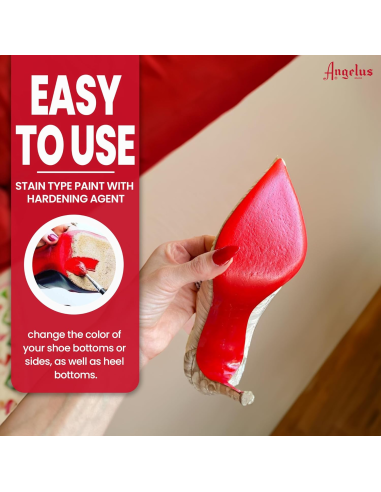Pintura para suelas de zapatos en tono rojo brilante. Pintura base acrílica con un endurecedor especial que garantiza un buen agarre en la suela de los zapatos.