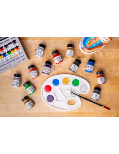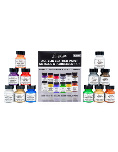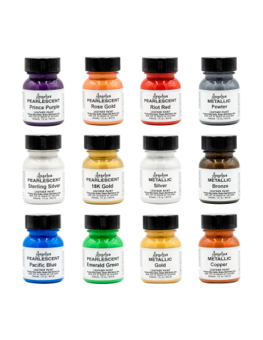 Kit de pintura para cuero de Angelus colores Metalizados y Perlados. Este juego completo incluye todas los colores de la gama para comenzar a crear hermosas obras de arte o restaurar sus piezas de cuero antiguas.