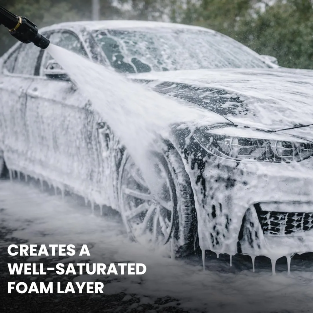 Gentle Snow Foam crea una capa de espuma uniforme y bien humedecida, que se pega durante mucho tiempo a la superficie, permitiendo un gran tiempo de actuación.