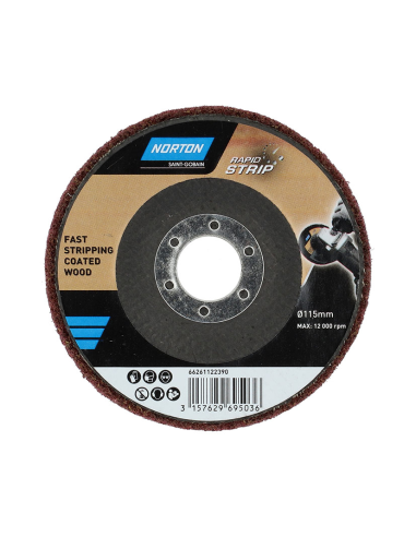 Disco norton de fibras no tejidas con nylon resistente y granos abrasivos para decapar capas de pintura o barniz en madera.