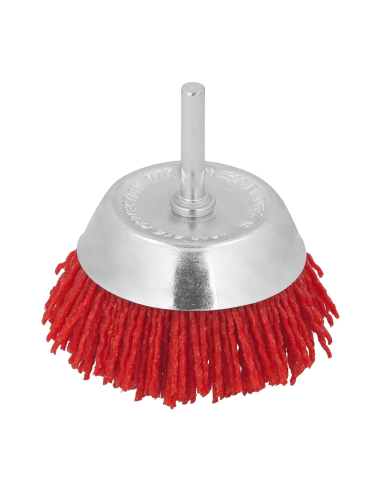 Cepillo copa de nylon con espiga con una medida exterior de 75 mm y una espiga de 6 mm/¼" para decapados en madera.