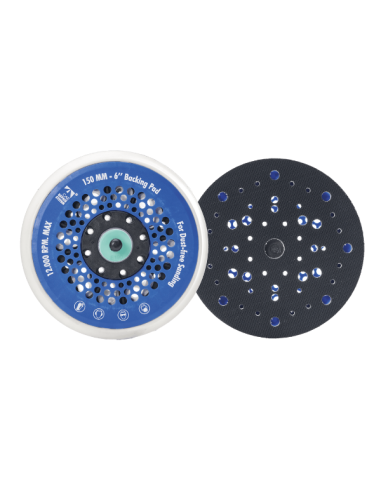 Plato con base de velcro y diámetro de 150 mm y métrica 5 con un sistema multicanal de aspiración que logra una eliminación total del polvo de la superficie de trabajo.