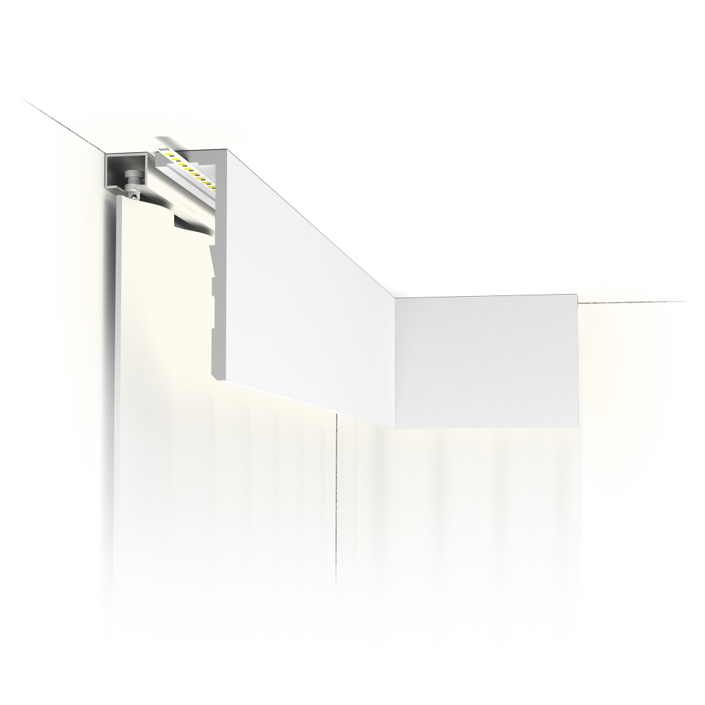 Cornisa CX217-2600 Ledge es lacornisa en forma en L más versátil: una cornisa, un perfil para cortinas y una fuente de luz, todo en uno. Elegante, ligera y de rápida instalación, Ledge es una sutil fuente de energía para los amantes del diseño elegante e inteligente.