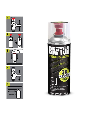 El kit incluye 2 sprays de pintura raptor 2K color negro de 400 ml y 1 spray de imprimación fosfatante ACID Raptor.