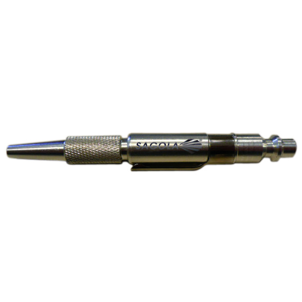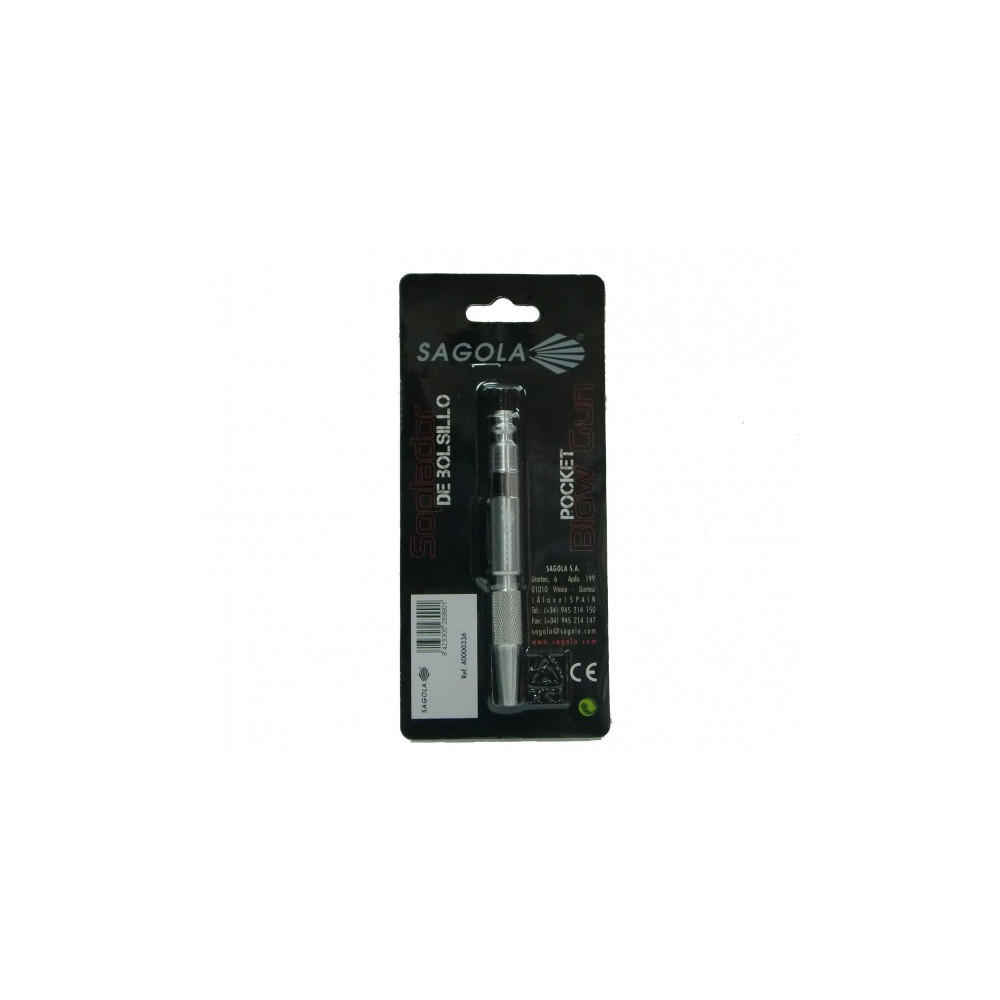 Soplador de bolsillo Sagola con clip tipo bolígrafo y caudal regulable. Contiene conector de enchufe rápido.