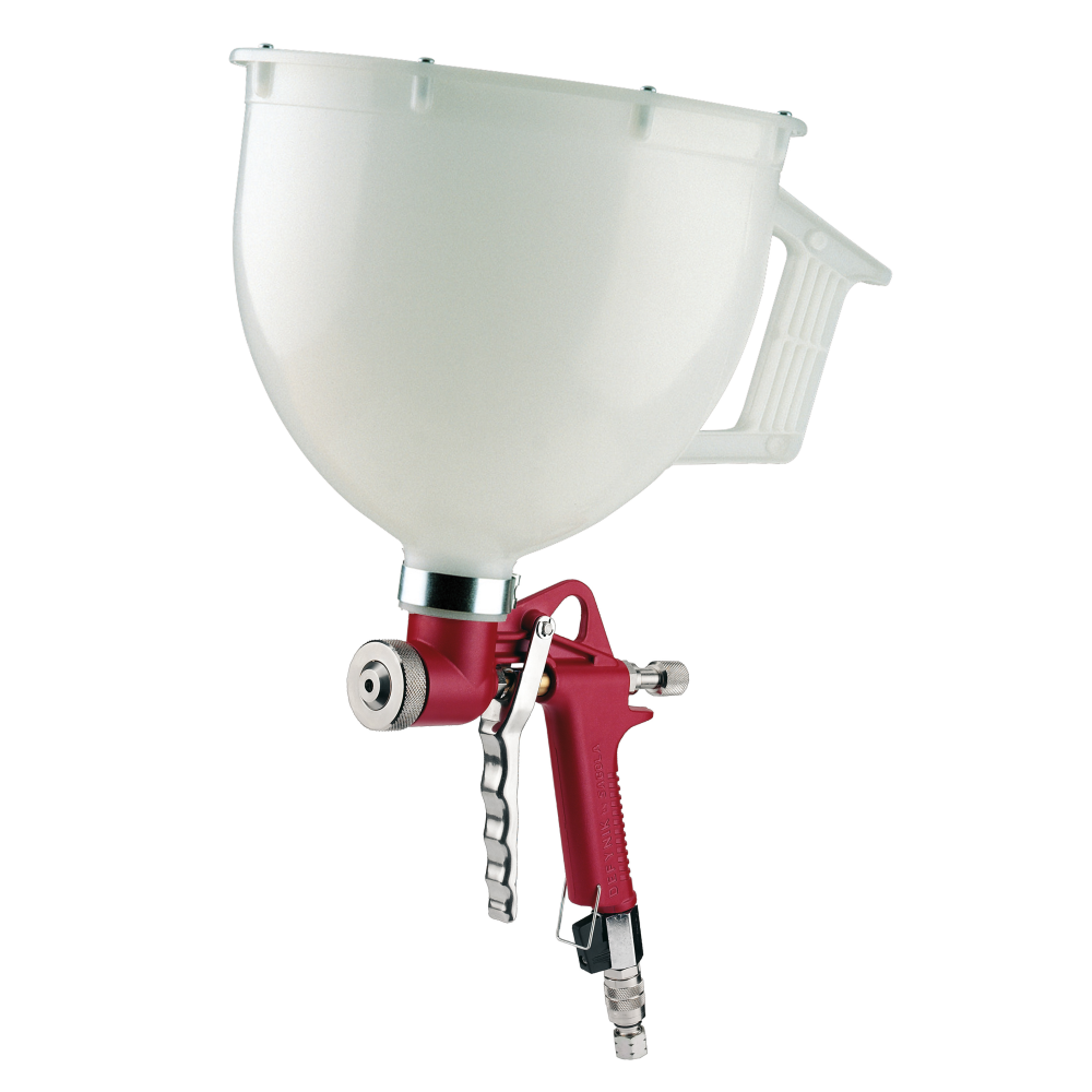 Pistola de gravedad premium 429 N de Sagola on válvula de cierre de entrada de aire y sistema antiatasco de producto. Reguladores de producto y caudal de aire.